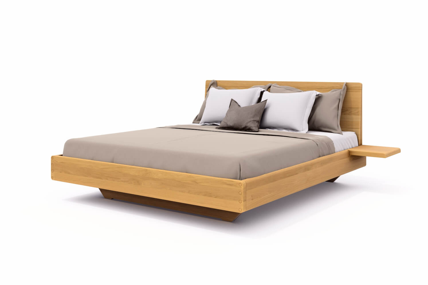 Výrazně ustoupený sokl a noční poličky coby malá křídla vyvolávají dojem vznášení se v prostoru. Krása řezu dřeva je patrná především u nočních poliček.