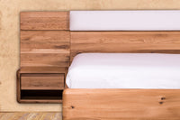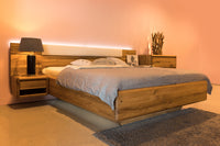 Masivní dubová postel Aria s nízkým čelem, čalouněním a úložným prostorem vyniká nevšedním efekt levitující postele. Tato manželská postel je vyrobena z masivního dřeva dub nature. Dub nature se vyznačuje přírodním výběrem unikátních přírodních lamel, které obsahují rovnoměrně rozvrstvené suky tmelené černým tmelem, který zvýrazňuje estetičnost daného suku. Lamely obsahují také praskliny, které jsou taktéž tmelené černým tmelem, který zvýrazňuje autentičnost dubového materiálu a přírodní surový vzhled. Barevný nesoulad celé plochy vzniká při výrobě záměrně, protože jsou vybírané tmavé lamely v kombinaci se světlejšími lamelami, aby se zvýraznila přírodní (naturální) stránka vzhledu dubového masivu.