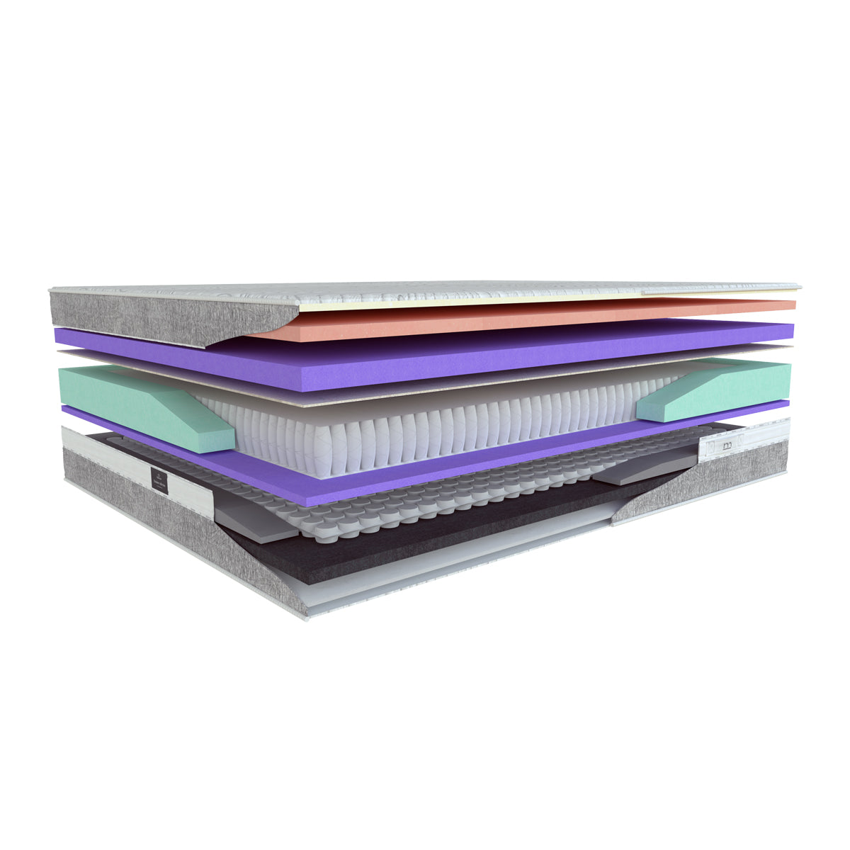– Výšku zajišťují dvě vrstvy taštičkových pružin v kombinaci paměťových pěn, HR pěn a pěny LAVENDER.