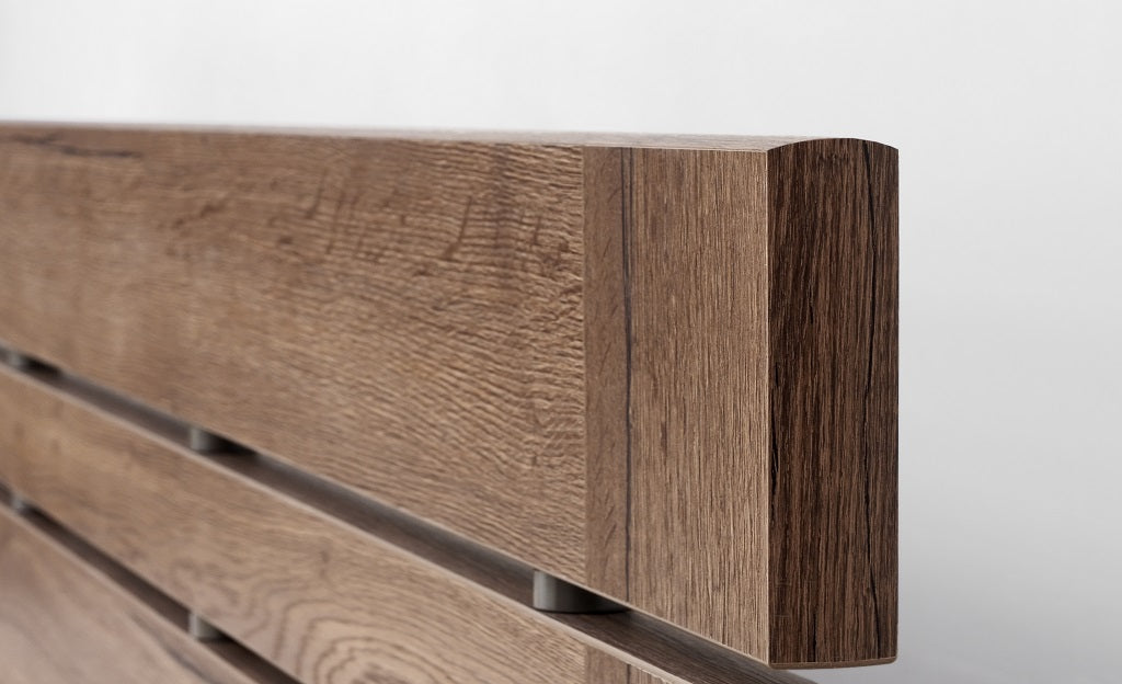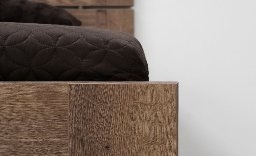 Postele imitace dřeva vyrobeny z vysoce kvalitních lamino desek firmy Egger a Kronospan, které splňují západoevropské standardy kvality a designu. Hlavním důvodem pro oblíbenost těchto postelí je, že nabízejí širokou škálu barev, které lze snadno kombinovat s dalším nábytkem v ložnici. Výhodou je nižší ceníková cena. Konstrukční díly jsou vyráběny z materiálu tloušťky 32 mm, postranice mají 32 mm, výplň zadního čela má 32 mm, příčky zadního čela mají 32 mm. Provedení postele může být s rovnými rohy, které je levnější na výrobu nebo s oblými rohy, které se ručně frézují a dokonaleji navozují atmosféru masivního dřeva.