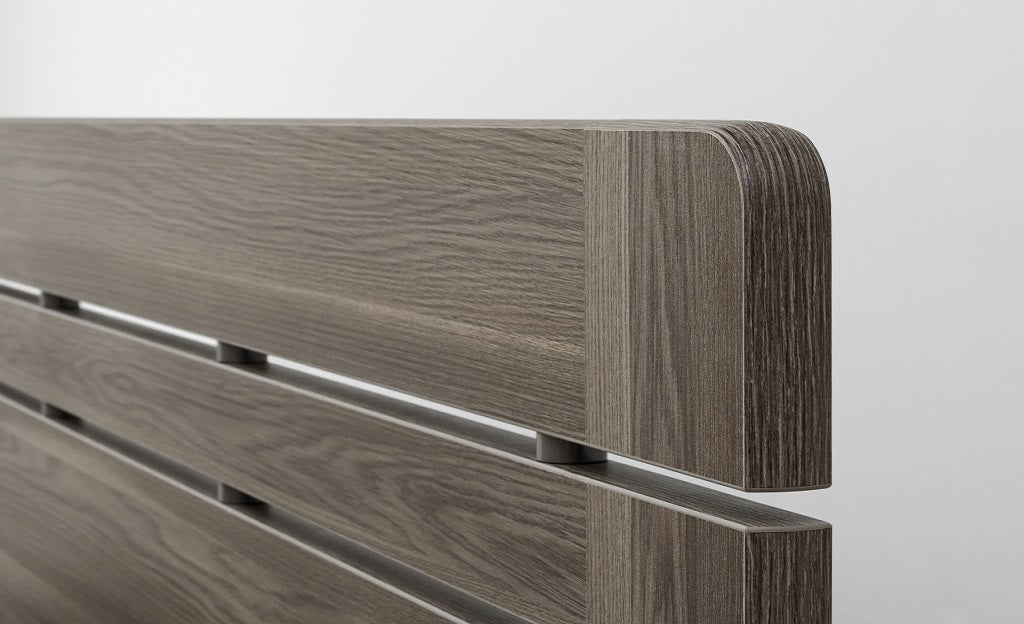 Postele imitace dřeva vyrobeny z vysoce kvalitních lamino desek firmy Egger a Kronospan, které splňují západoevropské standardy kvality a designu. Hlavním důvodem pro oblíbenost těchto postelí je, že nabízejí širokou škálu barev, které lze snadno kombinovat s dalším nábytkem v ložnici. Výhodou je nižší ceníková cena. Konstrukční díly jsou vyráběny z materiálu tloušťky 32 mm, postranice mají 32 mm, výplň zadního čela má 32 mm, příčky zadního čela mají 32 mm. Provedení postele může být s rovnými rohy, které je levnější na výrobu nebo s oblými rohy, které se ručně frézují a dokonaleji navozují atmosféru masivního dřeva.