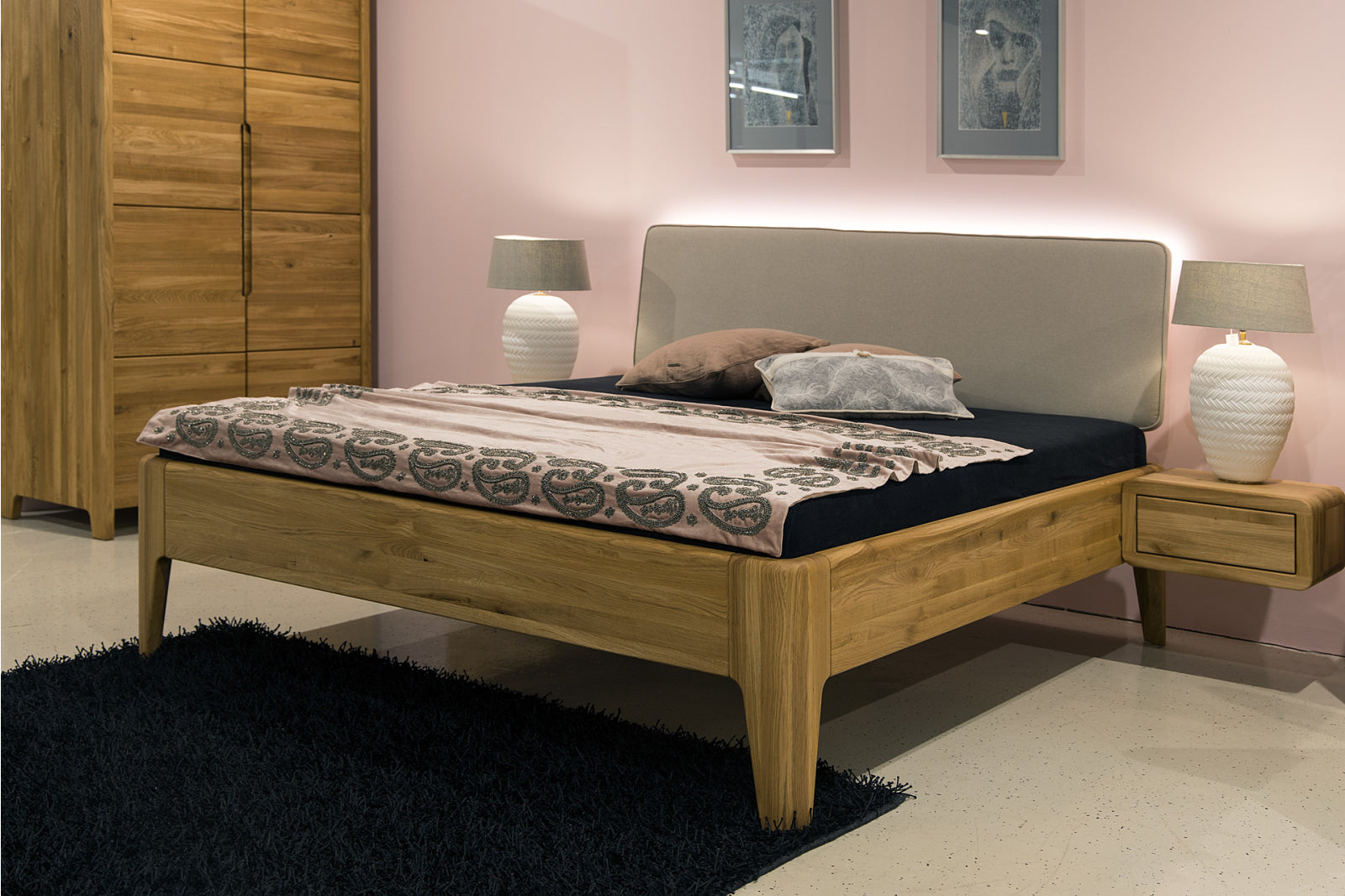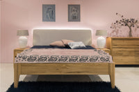 Manželská postel FANTAZIE s čalouněným čelem nízkým je dokonalou kombinací elegance, kvality a pohodlí. Tato manželská postel je vyrobena z dubu natur. Dub nature se vyznačuje přírodním výběrem unikátních přírodních lamel, které obsahují rovnoměrně rozvrstvené suky tmelené černým tmelem, který zvýrazňuje estetičnost daného suku. Lamely obsahují také praskliny, které jsou taktéž tmelené černým tmelem, který zvýrazňuje autentičnost dubového materiálu a přírodní surový vzhled. Barevný nesoulad celé plochy vzniká při výrobě záměrně, protože jsou vybírané tmavé lamely v kombinaci se světlejšími lamelami, aby se zvýraznila přírodní (naturální) stránka vzhledu dubového masivu.