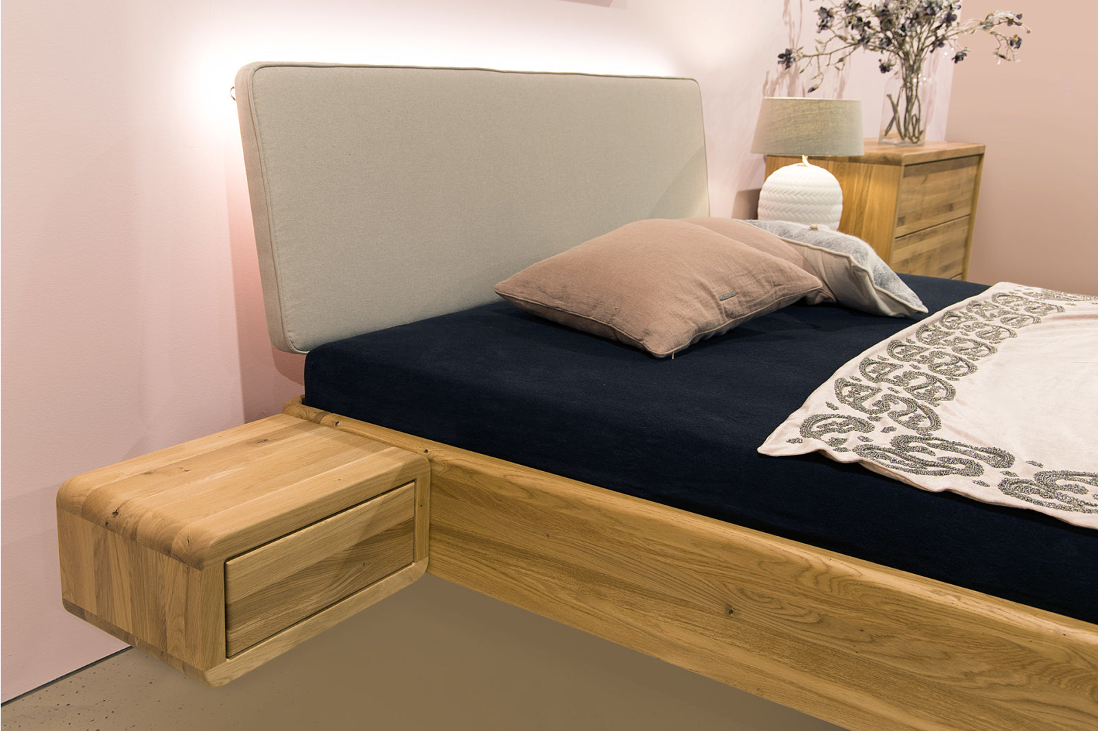 K manželské posteli FANTAZIE si můžete vybrat také noční stolky ze stejné kolekce. Noční stolek je navržen tak, aby ladil s postelí, je tedy zachováno stejné zaoblení hran i spojení rohů.