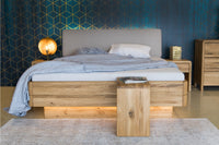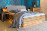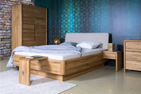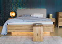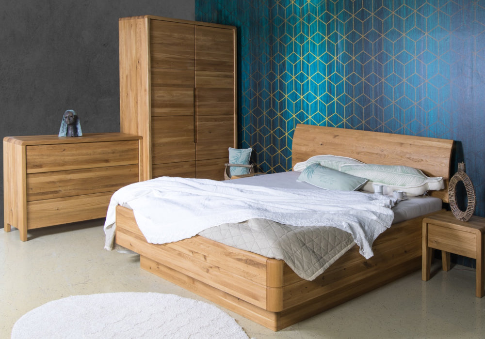 Manželská postel FANTAZIE s čalouněným nízkým čelem je dokonalou kombinací elegance, kvality a pohodlí. Tato manželská postel je vyrobena z dubu natur. Dub nature se vyznačuje přírodním výběrem unikátních přírodních lamel, které obsahují rovnoměrně rozvrstvené suky tmelené černým tmelem, který zvýrazňuje estetičnost daného suku. Lamely obsahují také praskliny, které jsou taktéž tmelené černým tmelem, který zvýrazňuje autentičnost dubového materiálu a přírodní surový vzhled. Barevný nesoulad celé plochy vzniká při výrobě záměrně, protože jsou vybírané tmavé lamely v kombinaci se světlejšími lamelami, aby se zvýraznila přírodní (naturální) stránka vzhledu dubového masivu.