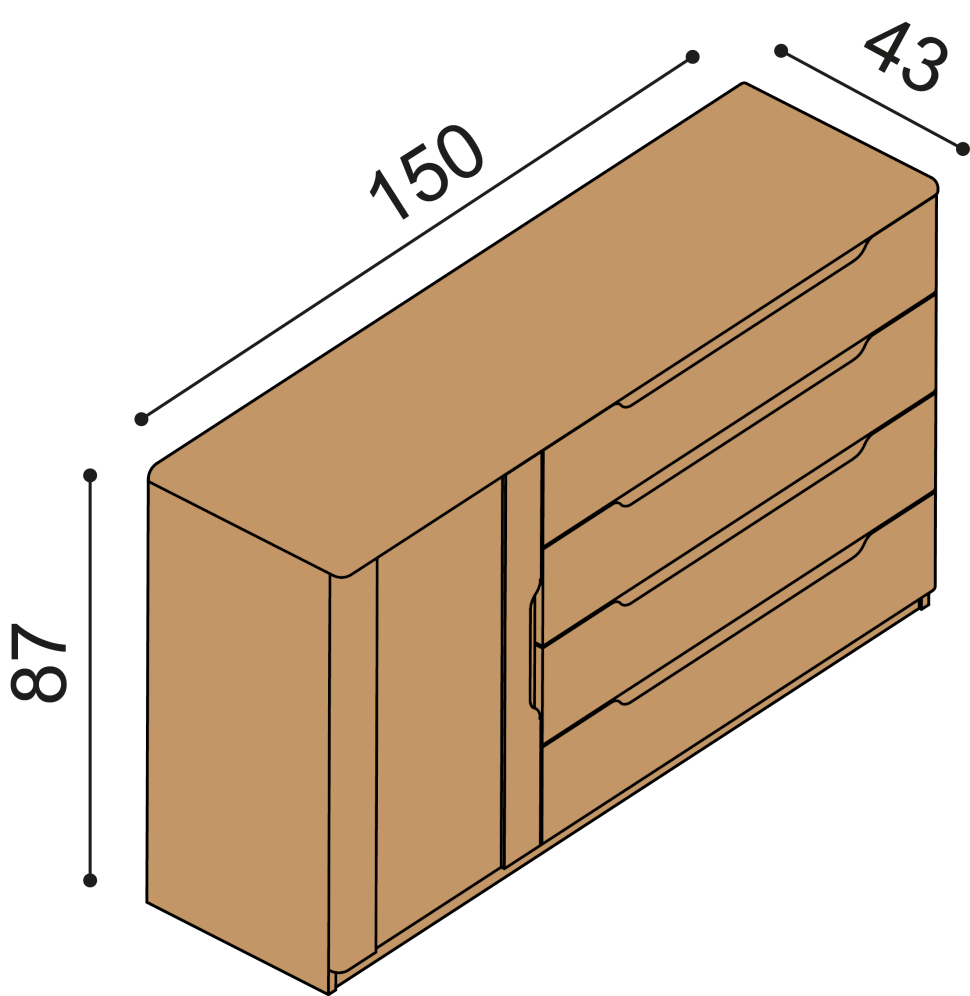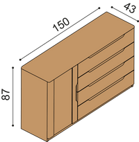 – Výška 88 cm, šíře 150 cm, hloubka 43 cm.