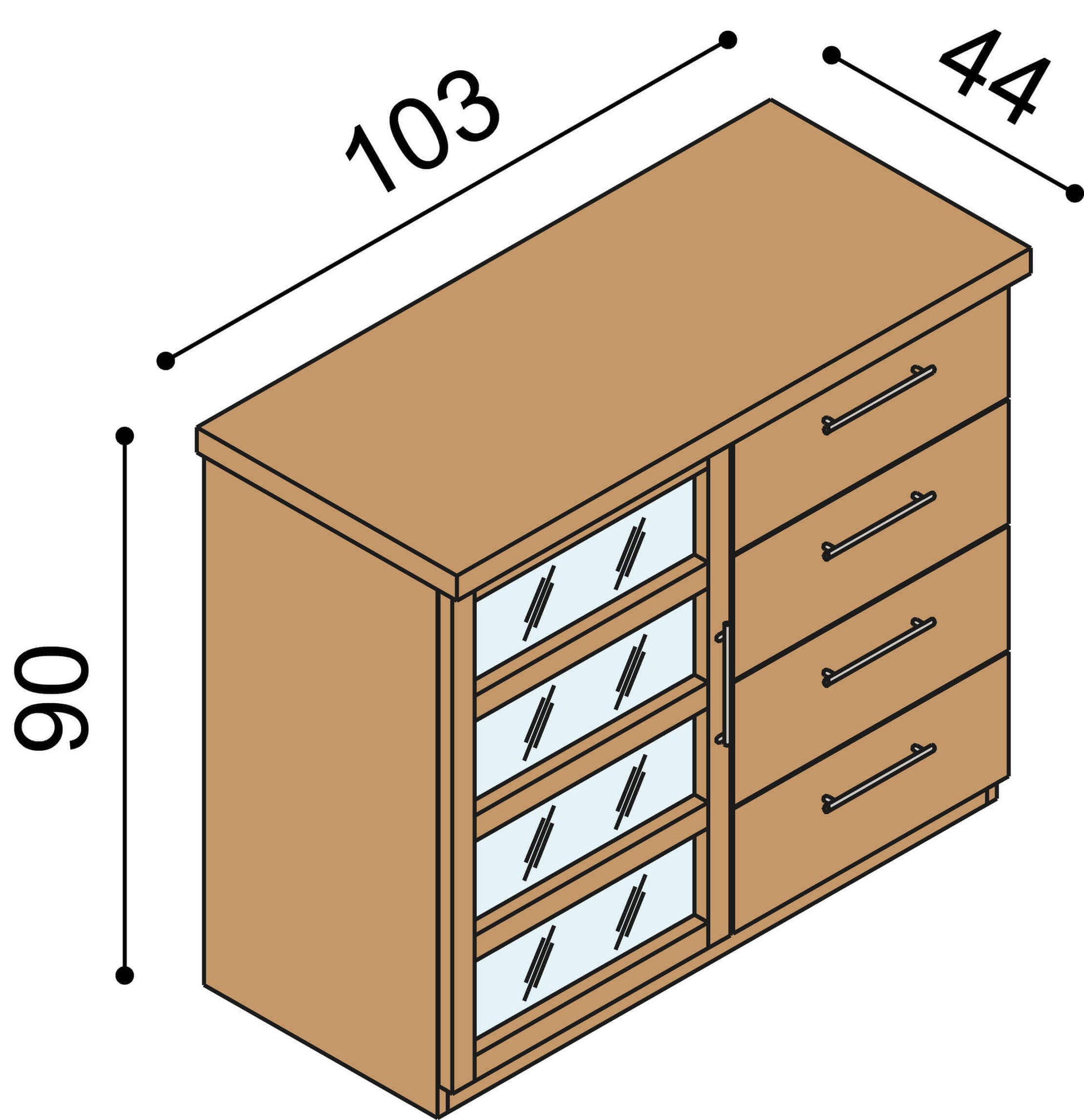 – Výška 90 cm, šíře 103 cm, hloubka 44 cm.