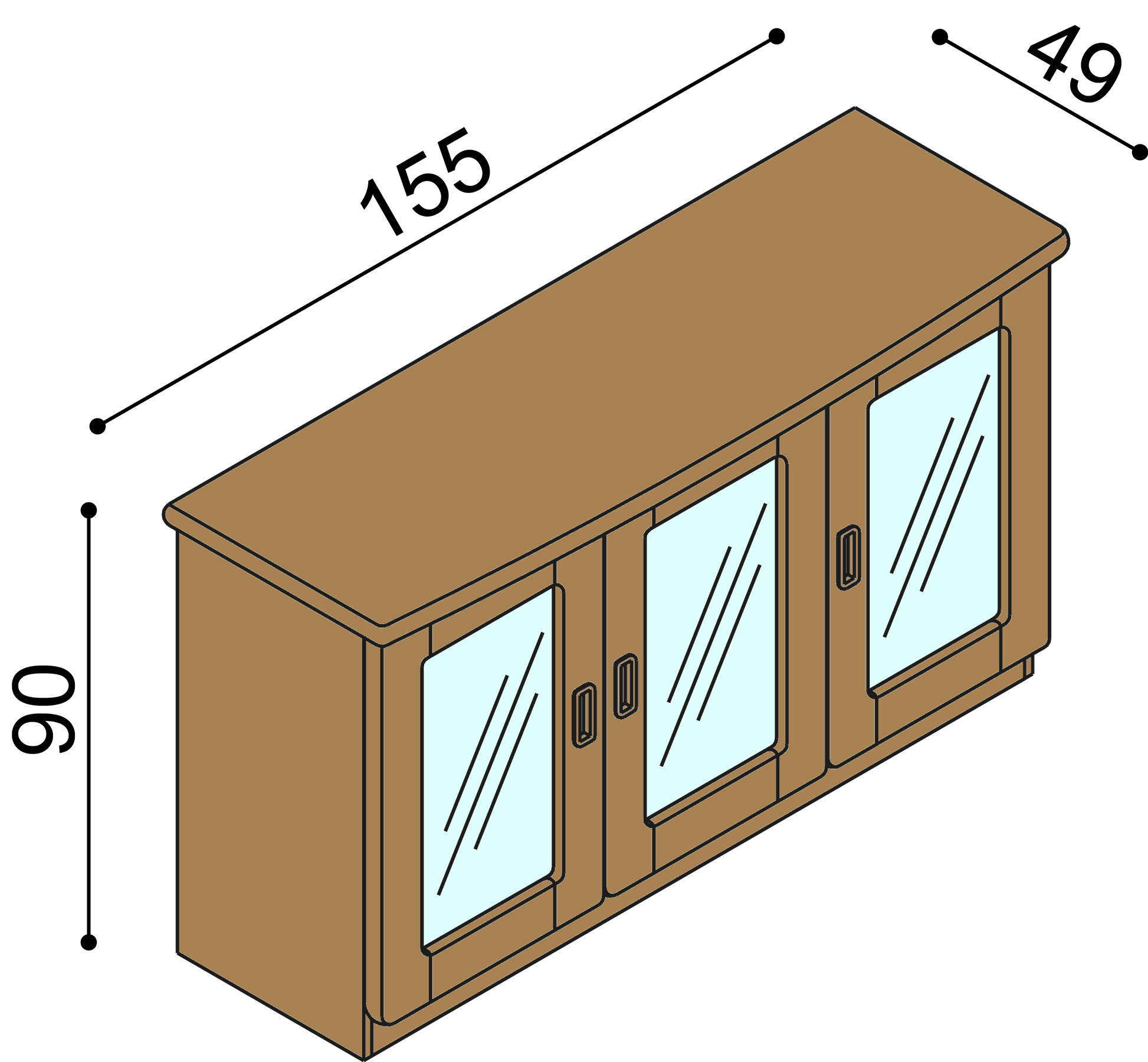 – Výška 90 cm, šíře 155 cm, hloubka 49 cm.