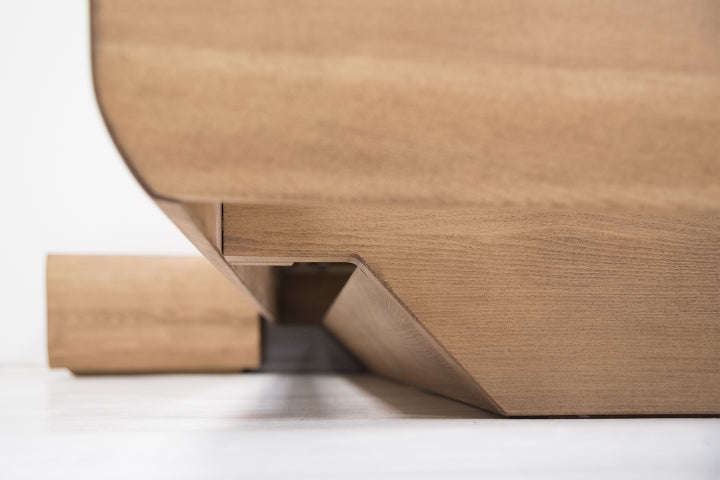 Manželská postel Levity s rovným čelem vyniká svým designem - ten je ovlivněný právě zabudovaným úložným prostorem. Díky lehce odsazenému úložnému prostoru postel vypadá, jako by mírně levitovala. Takto navržená konstrukce má několik výhod - velký, snadno přístupný úložný prostor, designově postel nevypadá příliš robustně, zpevnění celého rámu postele. Dno úložného prostoru je z bukové překližky tloušťky 4 mm a je vždy ošetřeno vámi vybranou povrchovou úpravou - stejným odstínem jako celá postel.