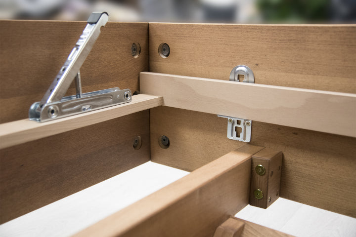 Jednotlivé části rámu postele jsou spojeny speciálním kováním Zipbolt. To se vyznačuje vysokou pevností, jednoduchou montáží a díky dotažení přes převod se neuvolňuje. Díky tomu můžete celou postel kdykoliv rozmontovat a znovu složit.