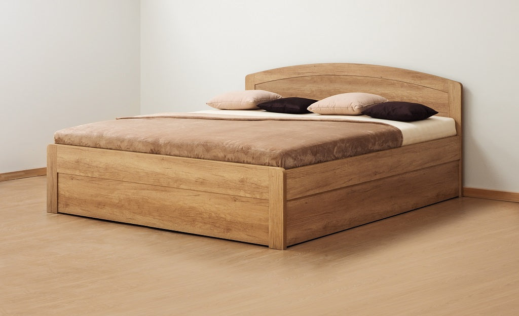 Postele imitace dřeva jsou vyrobeny z vysoce kvalitních lamino desek firmy Egger a Kronospan, které splňují západoevropské standardy kvality a designu. Hlavním důvodem pro oblíbenost těchto postelí je, že nabízejí širokou škálu barev, které lze snadno kombinovat s dalším nábytkem v ložnici. Výhodou je nižší ceníková cena. Konstrukční díly jsou vyráběny z materiálu tloušťky 32 mm, postranice mají 32 mm, výplně zadního a předního čela mají 16 mm. Provedení postele může být s rovnými rohy, které je levnější na výrobu nebo s oblými rohy, které se ručně frézují a dokonaleji navozují atmosféru masivního dřeva.