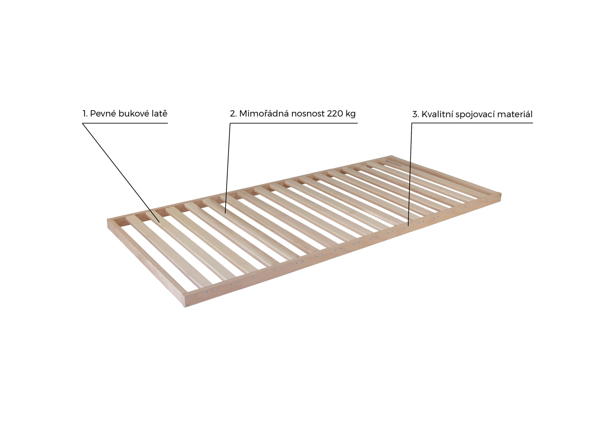 – 17 laťový pevný bukový rošt s nosností do 220 kg.