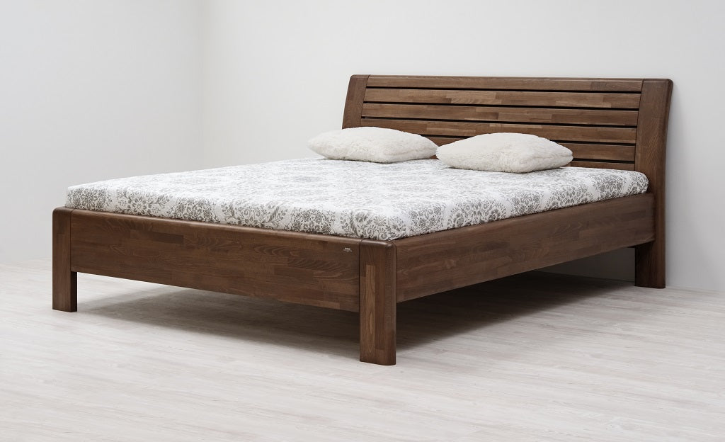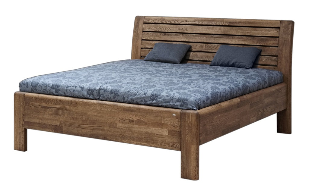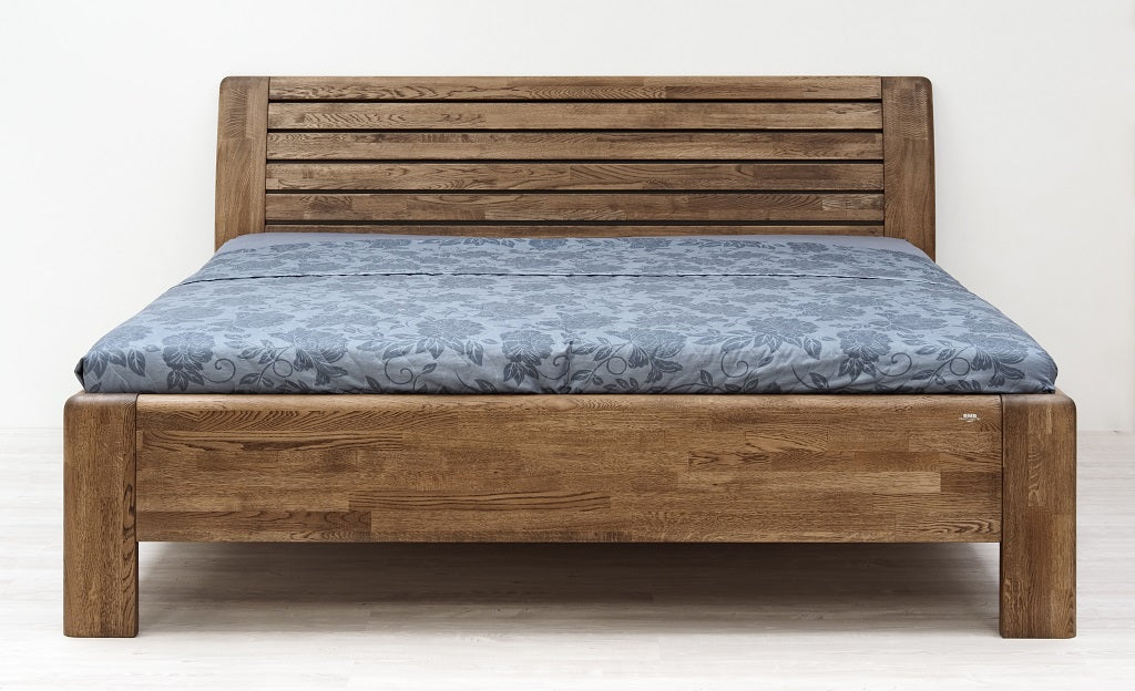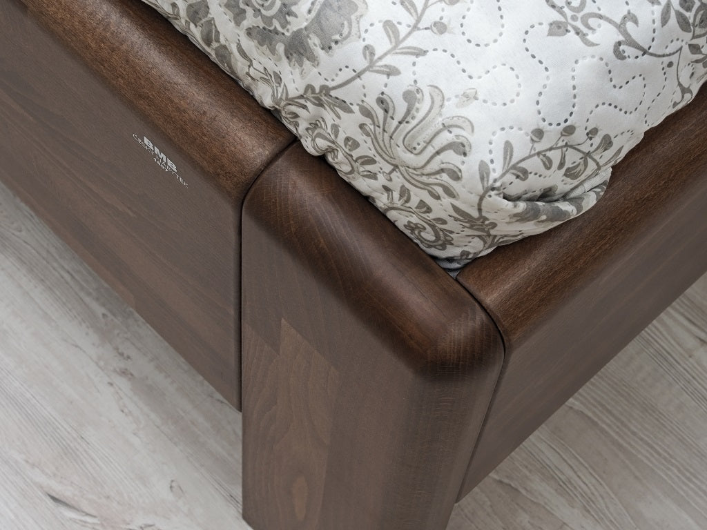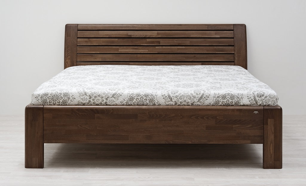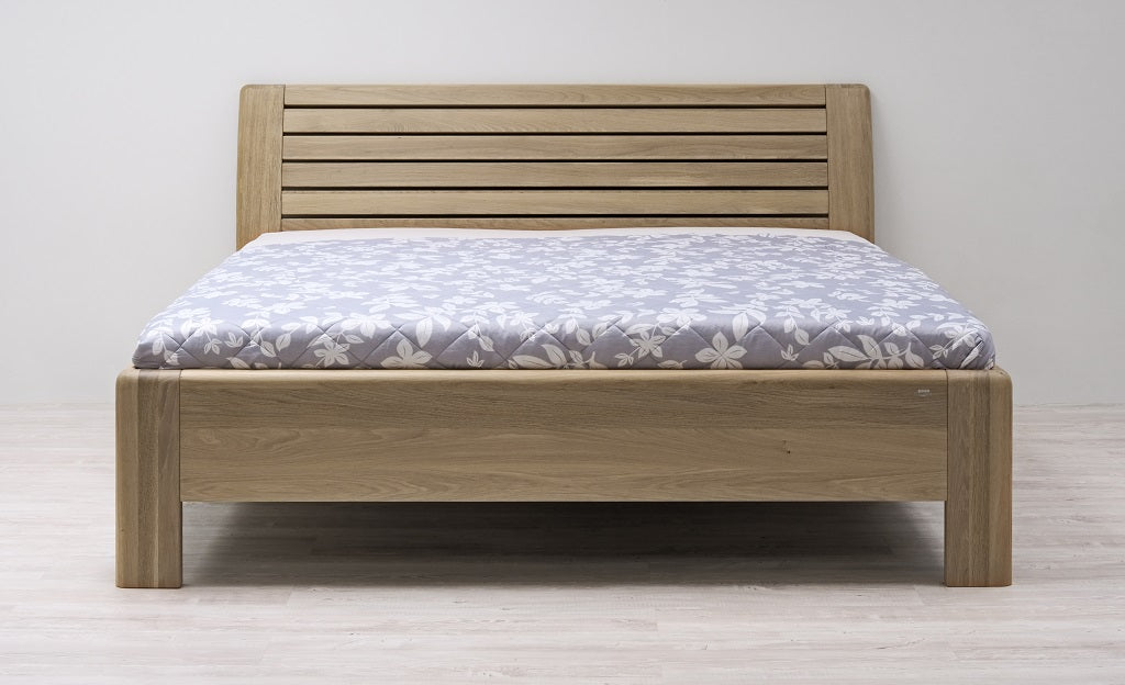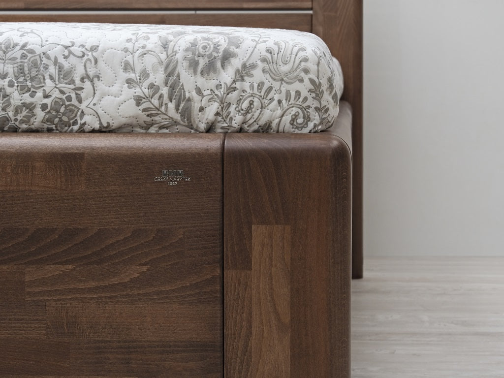 Masivní postel z designové edice. Moderní postel s členitým čelem v sobě spojuje praktické využití s dokonale propracovanými liniemi. Plnost masivního čela vytváří pocit solidnosti a jistoty, který se důmyslně doplňuje s jemně zaoblenými hranami po celé konstrukci postele. Vysoce kvalitní postel české výroby zajišťuje pohodlné a zdravé ležení. Postel má zvýšenou lehací plochu, kterou si můžete individuálně nastavit podle svých představ nebo s ohledem na výšku vámi vybrané matrace. Vysoká lehací plocha umožňuje pohodlnější vstávání a uléhání do postele, což ocení všichni uživatelé bez rozdílu věku.
